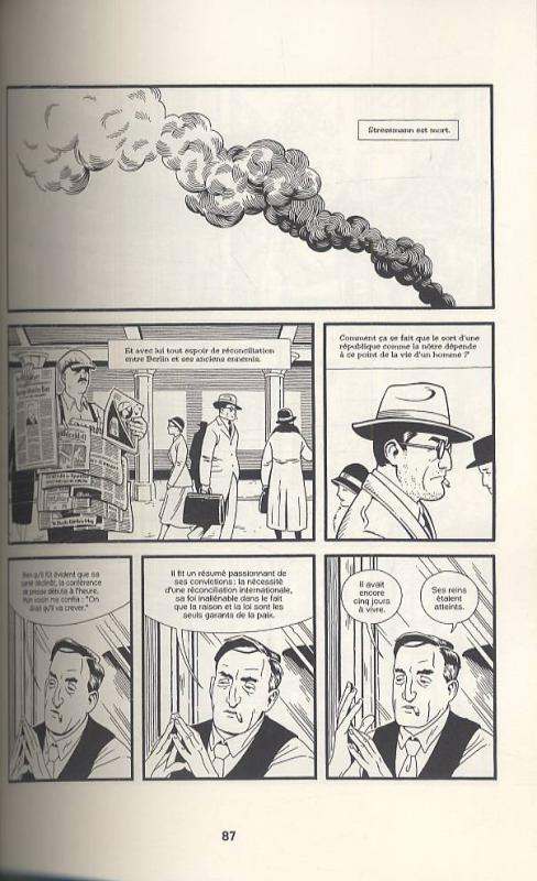 L’attente interminable pour découvrir la suite du fantastique roman graphique de Jason Lutes est enfin satisfaite ! A la sortie de l’unique premier tome au Seuil, on aurait pu croire la série maudite… mais lorsque Delcourt le ressortit en avril 2009, l’espoir renaissait… et la suite était attendue avec fébrilité. Reprenant directement l’histoire après les événements tragiques du volet précédent, à savoir les émeutes mortelles lors d’une manifestation communiste réprimée par les nazis, nous retrouvons la pléthore de personnages. D’un côté, Silvia doit survivre dans un monde où sa mère n’est plus ; son père est à la solde des nazis qu’elle déteste ; elle n’a plus de lieu où vivre. Pour Kurt et Marthe, leur couple continue de s’épanouir mais pas pour longtemps : les appels de la décadence berlinoise vont finir par poser de nombreux problèmes. Jason Lutes tisse son récit de manière subtile… On suit la montée en puissance des nazis, l’opposition presqu’inutile des communistes, le racisme ambiant, une population déconnectée de la réalité (entre concert et abus en tous genres) et une autre qui survit tant bien que mal. Le cadre de la ville de Berlin est toujours aussi bien mis en images par un dessinateur appliqué, dont le trait se rapproche de la ligne claire si appréciée de notre patrimoine bédéphile. La cité des pierres était instructive, Ville de fumée se veut captivante durant ses 8 chapitres et nous place de nouveau dans la position fébrile d’attente du dernier tome. Une série que les amateurs d’histoire se doivent de posséder dans leurs bibliothèques.