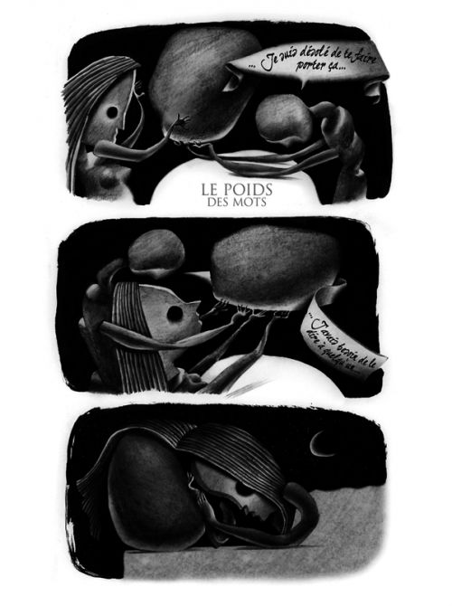 Un homme, à moins qu'il ne s'agisse d'un garçon, s'adresse à un chat noir. «Tu as perdu quelque chose ? » - «Non, je réfléchis» - «C'est vrai ?... Pas très prudent, ça. On commence par une pensée, puis une autre et une troisième... et ça continue, chaque pensée volant à travers ton cerveau jusqu'à ce que BOUM ! Elles percutent la paroi de ton crâne. «La bordure du monde». Le chat a l'air circonspect. L'humain et le félin surplombent un gouffre qui semble sans fin. Le petit chat aux yeux immenses courbe alors la tête vers le vide : «C'est très loin tout en bas» - «Plus loin que tes pensées les plus enfouies» - «Mais qu'il y a-t'il au-delà de mes pensées les plus enfouies ou la paroi de ton crâne, ou la bordure du monde ?» - «Ah, combien de fois n'a-t-on pas posé cette question... presqu'autant de fois qu'on a suggéré des réponses» - «Et donc ? » - «Eh bien, prends la Femme du Ciel et son mari, par exemple» - «Qui ça ? » - «L'histoire de la Femme du Ciel commence au Paradis, et là-bas,, elle commence par...»...