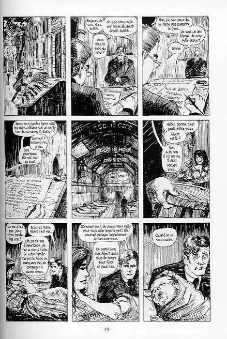 Après les chefs-d’œuvre V pour Vendetta et Watchmen, Alan Moore confirme son génie avec From Hell. Dans ce véritable pavé de la BD, le scénariste convoque des figures mythiques (Baal, Horus, Dionysos), bibliques ou littéraires, pour une plongée dans l’apocalypse du Londres victorien. Rien de surprenant pour les lecteurs de la Ligue des Gentlemen Extraordinaires : le programme de Moore s’abreuve encore une fois aux sources de l’enfer et du chaos pour dépeindre un monde cauchemardesque aux vertus libératrices. Ne pas s’y méprendre, From Hell n’est pas que le simple récit d’une enquête policière, avec un serial killer et des meurtres à élucider. Au-delà de l’intrigue assez anecdotique (il est en fait question d’une vague conspiration fomentée par les hauts placés), la BD propose une réflexion métaphysique d’une profondeur inouïe, prenant pour objets le pouvoir, l’aliénation de l’homme et sa folie. Œuvre résolument noire, brillante réflexion sur le mal et ses déclinaisons crépusculaires, From Hell plonge le lecteur dans les recoins de l’âme et de la conscience pour fabriquer son propre mythe, celui d’un mal sans fin. Tel un miroir ou un écho fantasmé, le graphisme d’Eddie Campbell se met au diapason de l’ambiance glauque, avec un noir et blanc dégoulinant de crasse, sale et charbonneux. Tour à tour dépouillé et rigoureux, le trait vient sublimer la portée symbolique du propos. Le mélange d’une écriture profonde et d’un dessin au cordeau, accouche d’une construction magistrale, propre à faire de From Hell un véritable chef-d’œuvre du 9e art. Soulignons enfin la rigueur d’Alan Moore. Car pour montrer le chaos, il se fait brillant chercheur en compilant une documentation très fouillée, quasiment exhaustive, dans une affaire où les convictions l’emportent largement sur les certitudes ; 40 pages de notes viennent clore ce roman graphique à l’équilibre parfait. Sombre portrait d’une modernité à venir, From Hell (qui annonce d’une certaine manière l’avènement des régimes totalitaires) vous invitera finalement à mieux connaître l’essence humaine. Une œuvre cathartique, un horizon indépassable... Culte.