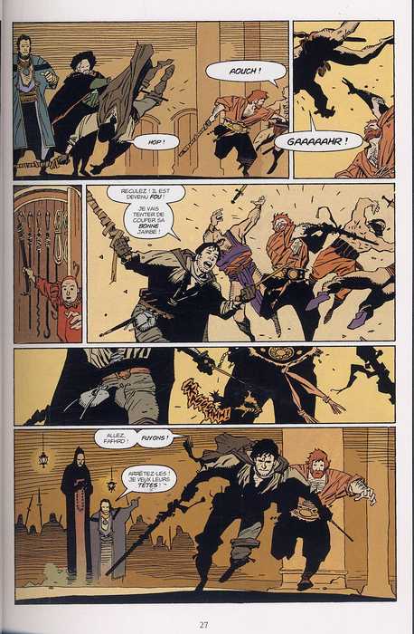 Le cycle des épées de Fritz Reuter Leiber, auteur américain d’heroïc-fantasy, se compose de 7 parties narrant les aventures de Fafhrd et du Souricier Gris. Le travail d’Howard Chaykin, qui a ici adapté le scénario, est colossal, car à chaque chapitre correspond un livre de Leiber. Ce morcèlement se conjugue en outre avec une forte densité de détails et d’aventures, difficiles à adapter intégralement en comics. Cela se ressent parfois par un léger manque d’explications, ce qui est loin de rendre incompréhensible l’histoire, fort heureusement ! Le dessin est assuré par le célèbre Mike Mignola, auteur de la saga Hellboy ! Le cycle des épées est néanmoins antérieur à ce dernier titre, qui l’a fait (re)connaître en dehors de ses frontières. On découvre ici, un trait beaucoup plus fin que sur ses récents ouvrages, un travail énorme sur les ombrages et des décors inspirés. A l’instar de ses autres ouvrages, il semble une nouvelle fois bien difficile de coloriser les travaux de Mignola, car les teintes choisies ne rendent guère hommage à son travail. Adapter un classique de la littérature n’est jamais chose aisée (demandez à Peter Jackson), mais cela abouti avec des auteurs aussi talentueux à un bel exemple de réussite !