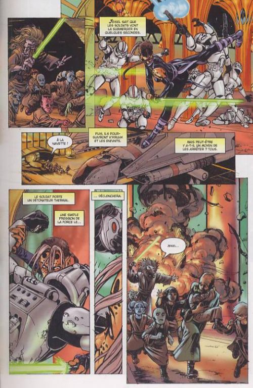 Avec Dark Times, les fans de Clone Wars sont aux anges car ils revoient une grande partie du casting de personnages de leur série favorite. Après un premier tome de bonne qualité, sa suite était attendue. Elle est de bonne facture elle aussi. Nous y suivons le Jedi Krukh tout faire pour protéger des enfants du terrible Ordre 66, décision qui a consisté à éliminer tous les Jedi et les padawans. Le scénariste Mick Harrison imagine une histoire accrocheuse, bénéficiant d'un rythme soutenu. Les scènes d'action sont nombreuses et spectaculaires. Elles raviront les fans de la série, tout comme les multiples décors que les dessinateurs proposent tout du long. Lui Antonio et Dave Ross alternent régulièrement leurs planches. Le résultat est bon, même si leur style n'est pas foncièrement identique. Ceux-ci connaissent bien les codes visuels de l'univers créé par George Lucas et offrent ainsi à la lecture d'être très plaisante. Une suite qui donne envie de poursuivre l'aventure.