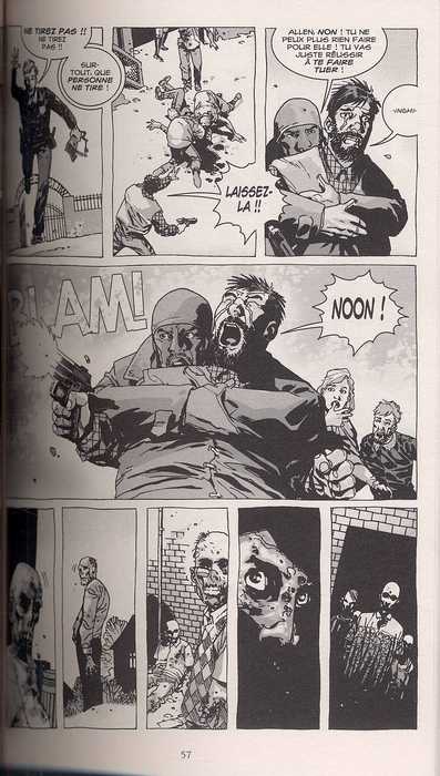 Depuis le début, le scénariste Robert Kirkman n’a pour intention principale, non pas de nous effrayer avec des ressorts gores ou spectaculaires, mais plutôt de nous montrer comment son personnage principal Rick Grimes va survivre au gré des situations se présentant à lui. Une approche un peu moins conventionnel pour une série où l’horreur se tapit derrière chaque ombre. D’ailleurs, ce second tome est moins axé sur l’appétit des zombies et nous confirme l’objectif du scénariste, également auteur d’Invincible, une série anticonformiste sur les super héros, et de Marvel Zombies. Le passage de relai entre dessinateurs (nous sommes passés de Tony Moore à Charlie Adlard, à la fin du premier volume) montre par moments une baisse de régime dans la qualité des dessins, notamment dans la finition des visages, zombies ou personnages principaux. Les influences de films mythiques sont également moins présentes, donnant par là même son véritable ton à la série. Poursuivant de manière fort plaisante, cette série n’aura au final qu’un seul défaut : le dessin moins fignolé de Charlie Adlard. Mais ne gâchons pas notre sadique plaisir, Walking Dead est une des rares séries à être intéressante et originale dans son approche.