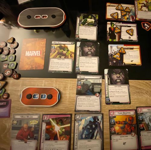 On attendait en cette fin d’année la nouvelle grosse boîte d’extension de Marvel Champions Civil War mais sa sortie a été retardée en France (il faut encore patienter jusqu’au début de la nouvelle année 2026). Hasard du calendrier ou mauvaise gestion, l’extension scénario Le clash des Synthézoïdes, qui est censé suivre et accompagner la boite Civil War, est sortie dans l’Hexagone… avant ! Malgré ce petit couac, cette boite qui devait être la bûche de l’hiver peut tout de même se jouer sans la boîte principale et constitue donc un apéritif de fête avant le gros gueuleton Civil War ! A l’image de l’event des comics où tout est bouleversé et remis en question avec la guerre fratricide entre super-héros, ces scénarios changent la façon de jouer et proposent un mode compétition ! Vous pourrez toujours jouer en solo ou en coop contre les deux personnages de la boîte mais vous pouvez également affronter un ou plusieurs adversaires pour la première fois dans Marvel Champions. Cette petite révolution (qui était la thématique de base de la boîte Civil War) a tout de même l’avantage de ne pas jeter aux oubliettes le mode précédent : il y a donc quelques cartes et effets qui permettront de jouer en coop et d’autres cartes et effets en compétition. L’autre nouveauté, c’est que vous n’affronterez plus un super-vilain mais un super-héros suivant le camp que vous avez choisi ! Le méchant devient un leader et, en compétition, vous ferez tout pour que votre leader batte vos adversaires. Affronter Miss Hulk sera tout sauf une partie de plaisir tellement Jennifer Walters est violente et Vision, certes moins impressionnant, aura tout de même quelques effets bien désagréables. L’expérience de jeu est tout aussi positive en coop qu’en compétition et même si ce nouveau mode est un peu artificiel (les joueurs ne jouent pas directement contre les autres mais dans deux tables séparées), il est tout de même bien pensé. La thématique sur la Loi de recensement est également parfaitement exploitée avec des nouveaux sbires qui vont vous faire saliver et l’on sent avec tristesse le poids de la législation qui a déchiré l’univers Marvel. On attend désormais avec impatience la boîte Civil War.