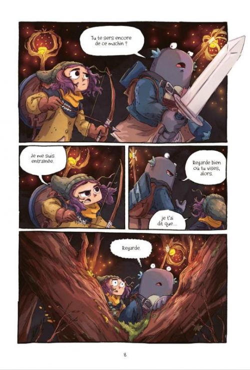 Nous l'attendions avec impatience, il est enfin arrivé : le troisième tome de la série Lightfall. Le premier tome posait le décor avec luminosité et enthousiasme. Nous avons poursuit les aventures épiques de Cad et Béa dans le second volet. Ce troisième roman graphique a une note là encore singulière. Les ténèbres ont envahi les terres et c'est la noirceur qui domine. Le danger est partout, les personnages sont sur leurs gardes. Cet album est une transition, très contemplative, avec de nombreuses pages sans texte, qui plonge le lecteur dans la contemplation et la réflexion. Les actions sont plus diluées, et Tim Probert se concentre sur le développement de la psychologie des personnages. Les épreuves qu'ils traversent les changent. Ils ne sont plus les mêmes. Bien sûr, Cad conserve son air attachant et enthousiaste, mais la tristesse et les interrogations prennent le dessus. Il n'est plus le « rigolo de service ». Quant à Béa, elle n'arrive pas à surmonter ses angoisses aussi facilement qu'elle le souhaiterait, et l'avancée fastidieuse de la quête ne fait que les renforcer. L'auteur délivre en filigrane un message en faveur de l'écologie. Béa doit écouter la nature et les éléments pour obtenir des réponses et de l'aide. L'absence de soleil menace aussi la biodiversité et la vie en général. Les illustrations restent magnifiques, portées par un dessin rond et enveloppant, notamment dans la colorisation. Même si celle-ci est plus sombre, en lien avec les sujets traités, elle n'en reste pas moins très réussie. L'auteur accentue notamment les jeux de lumières, pour créer des ambiances aussi belles qu'effrayantes. Vivement la suite !