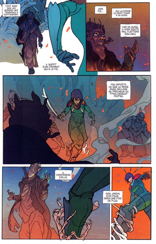 Ody-C est typique du comic book clivant : il trouvera certainement des lecteurs qui en seront passionnés et d'autres, dans la catégorie desquels nous nous rangeons, qui s'en sont rapidement lassés. Et là, bon courage, parce que, comme tout Omnibus qui se respecte, le volume est épais : 336 pages. C'est donc un état de fait, quoiqu'il arrive, vous allez être embarqués dans un long voyage qui, pour le coup, ne trahit rien du concept d'une odyssée. Alors essayons de souligner les qualités et les défauts de l’œuvre. Matt Fraction, le scénariste, roule sa bosse dans l'industrie des comics depuis une bonne dizaine d'années et il n'est pas le premier venu, bien qu'il fasse également controverse, notamment parmi les fans de Marvel – cf le catastrophique Age of Ultron auquel il a participé. On peut lui reconnaître ici d'avoir l'ambition de remettre en avant une histoire autre que celle de supers-slips amenés à sauver l'Humanité, certes. On peut aussi souligner qu'il amène sa touche perso à cette réinterprétation, en introduisant un postulat intéressant, qui repose d'une part sur le fait que Zeus est un personnage féminin, et qu'il invente un troisième genre, capable d'auto-procréer, ce qui questionne aussi la filiation, thème central dans la mythologie grecque. De ce point de vue, sachons reconnaître la réussite de cet apport. Ajoutons que l'ensemble est traité de façon assez psychédélique et vous pourrez penser que l’œuvre est riche. Pour autant, les dialogues sont tellement ampoulés (osons même le dire, l'écriture est affreusement pompeuse) qu'ils en deviennent indigestes. Pas de bol, la narration est bavarde. Il faudra donc s'accrocher, et bien fort, si on n'est pas séduit. Côté dessins, Christain Ward propose un traitement intéressant et plutôt original, même si ses couleurs sont tellement vives qu'elles saturent la rétine. Si son découpage est audacieux, le dessinateur n'est pas non plus aidé par la place faramineuse que prennent parfois les phylactères, réduisant aussi la visibilité des planches. Vous l'avez compris, il faudrait être de mauvaise foi pour dire que ce livre n'est pas bon, mais pour autant, il est assez loin de nous avoir plu. Alors on s'en remet à votre propre jugement, qui finalement, est bien le dernier qui compte. Bon voyage !