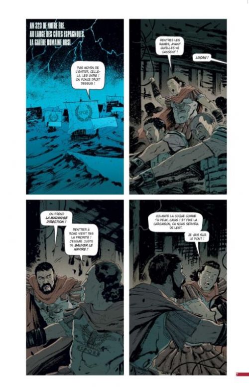 Le pitch initial est épatant et plein de promesses : et si les romains avaient traversé l'Atlantique et débarqué en Amérique bien avant Christophe Colomb ? On est happé par ces premières pages étonnantes qui donnent une tournure imprévue à la rencontre avec les autochtones. Mais très vite, on comprend que les auteurs ont voulu pousser leur ambition jusqu'à dessiner une histoire sur plusieurs siècles, ce qui dilue très vite la force de leur idée initiale. N'est pas Jean-Pierre Pécau qui veut, pourrait-on dire, en comparant l'approche de Justin Giampaolo et Brian Wood avec celle de l'auteur de Jour J, qui détourne également des moments de l'Histoire, mais creuse bien plus profondément la conséquence d'événements alternatifs. En choisissant de parcourir près de 20 siècles en quelques épisodes, ils ne font qu'ébaucher des possibilités, et tentent tant bien que mal de se raccrocher à la descendance des premiers romains arrivés sur le continent pour donner une forme de continuité à leur récit. On survole d'autant plus cette épopée que les dialogues semblent avoir été traduits de manière un peu rapide, avec des expressions très actuelles et des tournures de phrase qui ne peuvent pas figurer dans le récit initial en langue anglaise. Il reste le dessin réaliste élégant et nerveux d'Andrea Mutti, brillant dessinateur italien qui a l'habitude de voyager du franco-belge au comics, avec une belle aisance. Ses pages régulièrement découpées en quatre blocs s'accommodent sans souci de toutes les époques, et nous font imaginer ce qu'aurait pu donner cette idée sur le long cours. Rome West est un livre à lire plus lentement que la normale, pour se donner le temps que son format ne nous donne pas, et apprécier un voyage tout de même original et bien construit.