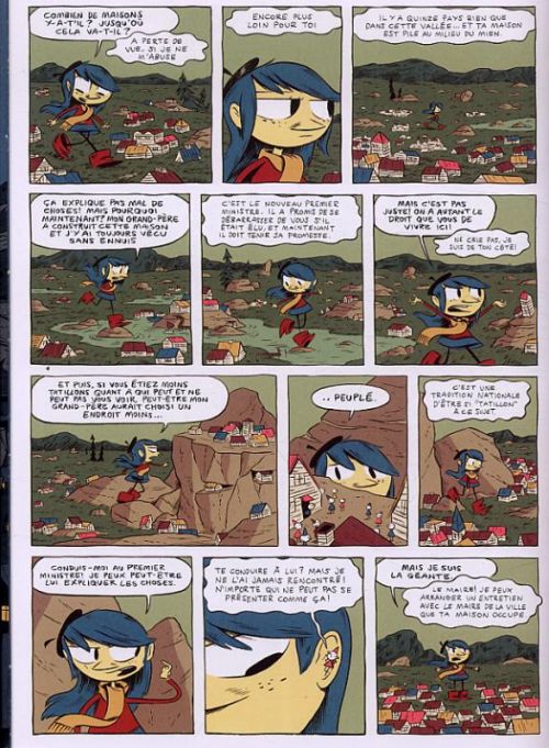 Après une première aventure réussie, le britannique Luke Pearson revient avec son héroïne fétiche, un petit brin de jeune fille aux cheveux bleus, amoureuse de ses montagnes. La recette, diablement efficace, est toujours la même. L'histoire commence cette fois-ci par une scène assez angoissante, une attaque à coups de pierre de la maison d'Hilda par des petits elfes invisibles. S'ensuit des tractations bizarroïdes avec Alfur, habitant minuscule d'une ville elle aussi minuscule devant la maison d'Hilda...Luke Pearson convoque plus tard monstres, rois, ministres, créatures magiques et évidemment des géants, "banalités magnifiées, images de la démesure au profit des instincts corporels et brutaux" (J. Chevalier). Luke Pearson emboîte les récits et crée un style personnel, à la fois onirique, fantastique et tendre, destiné à tous publics. Outre la fable et son message philosophique, le graphisme emporte tout autant l'adhésion, par sa justesse dans les tons et les couleurs, ainsi que sa lisibilité, le tout source d'enchantement et de merveilleux. Un récit donc plaisant, riche et profond qui laisse filtrer un questionnement malicieux sur la tolérance et les codes qui permettent de vivre ensemble, de faire société, sans oublier un peu d'amour à l'épreuve du temps. Une série jeunesse de qualité.