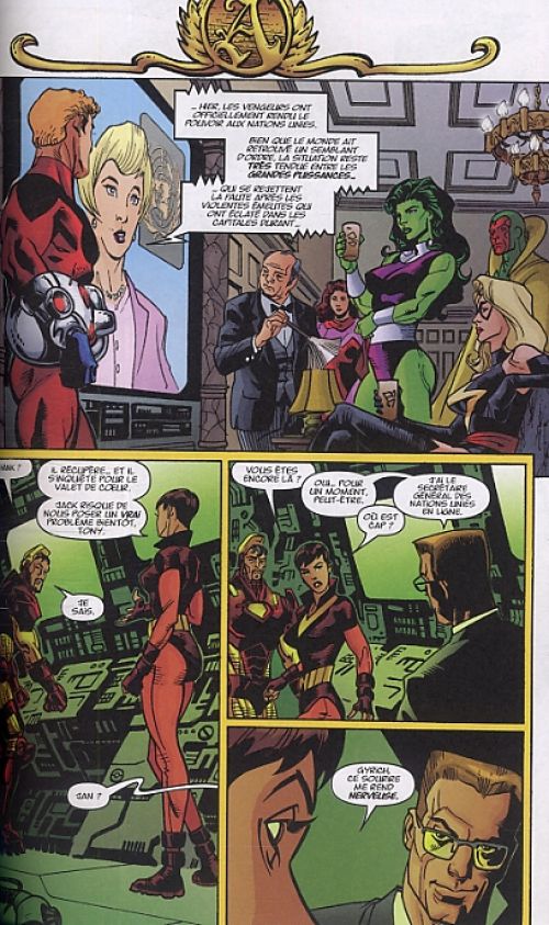 Les Avengers (Vengeurs) ont toujours été une vitrine pour Marvel. L’équipe de super héros a souvent regroupé un casting prestigieux et nombreuses sont leurs aventures qui ont fait vibrer l’imagination des lecteurs. Pour inaugurer la série au sein de la collection Best Comics, le choix a été porté sur une saga en six épisodes de Geoff Johns. Le scénariste, qui deviendra plus tard le grand architecte du DC Universe, succède à une longue lignée d’épisodes créés par Kurt Busiek dont certains sont parus récemment au sein de Marvel les grandes sagas. L’histoire est assez simple puisque l’on confie aux Vengeurs la responsabilité de diriger le monde suite à la disparition des capitales de la planète entière et donc, de leurs chefs d’Etat. Cette idée assez brillante sur le papier n’est malheureusement pas très bien développée par Johns. Les super héros ne prennent aucune décision politique, ni même administrative, mais se contentent d’aller casser la figure du responsable de la disparition des cités. Dommage, car avec une idée similaire, The Authority a fait bien mieux. Les amateurs de grosses bastons avec de nombreux personnages seront aux anges car Johns se débrouille bien dans l’ensemble, même si cela manque un brin de suspense. L’album se termine sur une scène assez intéressante mettant en scène le Valet de Cœur et l’Homme Fourmi. Kieron Dwyer et Gary Frank s’occupent tous les deux des dessins. Même si le rendu est assez classique, le trait de chacun reste appliqué et agréable. Cette aventure n’est pas la meilleure des Avengers mais reste distrayante, surtout si l’on suit depuis fort longtemps les péripéties de la bande de justiciers.
