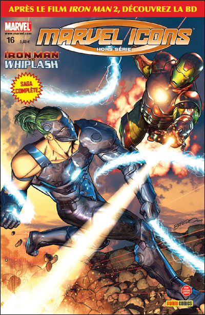 Les fans de la série Iron Man et des films qui en ont été adaptés récemment attendaient avec curiosité ce nouveau hors série de Marvel Icons. En effet, on retrouve une saga (de 4 épisodes) dans laquelle l’homme de fer affronte Whiplash (joué dans le film Iron Man 2 par Mickey Rourke). L’histoire présentée est simple : un village russe est détruit par ce qui semble être Iron Man. Un des survivants se construit une armure et souhaite se venger ! Ajoutez à cela une dimension réaliste comme la Cour Internationale de la Haye où se jugent les crimes de guerre (entre autres) et vous obtenez un récit basique mais efficace. Les chapitres sont illustrés par le frenchy Philippe Briones et l'italien Andrea Mutti. Aucun faux pas n’est commis de leur part, les planches sont spectaculaires et le trait est soigné. Whiplash est d’ailleurs assez charismatique, dommage qu’on ne le voit pas plus. Ce nouveau hors série réussit à ne pas être un produit dérivé sans âme et il est au final assez distrayant. Un bon numéro, qu'on vous recommande.