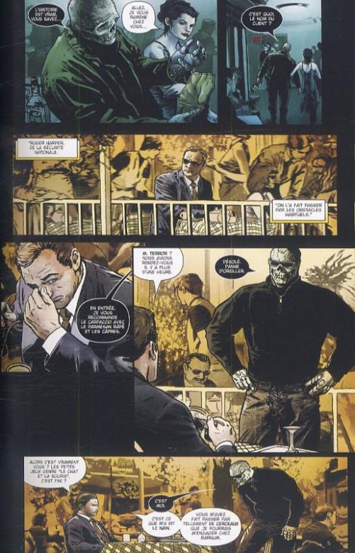 Chez Marvel, il y a bien sûr des personnages de premiers rangs comme Spider-Man ou Wolverine mais on en décompte aussi d'autres bien moins connus. Terror a été créé en 1988 sous le nom de Schreck (rien à voir avec l'ogre vert !) et n'a pas vraiment eu droit à beaucoup d'épisodes pour dévoiler ses capacités hors du commun. Il aura fallu attendre 2007 pour qu'au sein de la collection Max sorte une saga en 5 chapitres. C'est à un spécialiste du récit de genre, David Lapham, que la maison aux idées a confié les rênes de ce come back placé sous le signe de la violence. Il faut dire que Terror est assez atypique puisqu'il s'agît d'un homme maudit qui vit depuis 1500 ans avec un corps en décomposition permanente. Pour éviter de mourir, la seule solution consiste à ingérer des membres appartenant à d'autres individus ou animaux. En faisant cela, il absorbe également leurs pensées ou leurs techniques. Le premier épisode résume parfaitement le passé de cet anti-héros avec un humour noir salvateur. Par la suite, Terror devient détective privé et enquête sur une affaire où il sortira comme étant le dindon de la farce. Lapham dévoile un talent certain pour le morbide et le sanguinolent dans Terror Inc.. Son récit est plutôt agréable à suivre si l'on a les tripes bien accrochées, même si l'on note une certaine lassitude sur la fin. Il faut dire que le mélange des genres imposés par le scénariste (espionnage, action, horreur) perd en efficacité par instant. Patrick Zircher s'est fait remarquer sur Iron Man mais jusqu'ici, il n'a pas été aussi bon que sur Terror Inc.. Ses planches sont sombres à souhait mais bénéficient d'un niveau de détail assez impressionnant. Le dessinateur n'hésite pas à flirter avec le dégueulasse et s'y complait pour le plaisir des amateurs du genre ! Terror Inc. n'est pas le summum de l'horreur mais se place comme un divertissement défoulant et plutôt jubilatoire.