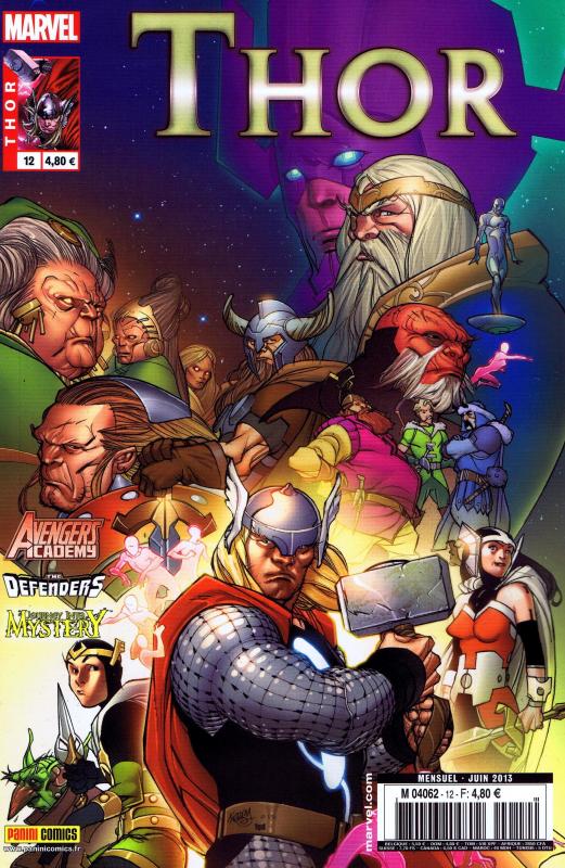 La seconde génération de revues Thor se termine avec ce douzième numéro. En effet, le grand reboot des séries Marvel chamboule le menu général des publications kiosques de Panini et marque la fin de certaines séries. C'est le cas des quatre titres présents au générique. Le crossover Combustion totale se termine avec les ultimes épisodes de The Mighty Thor et de Journey into Mystery. Dans le cas du premier, Matt Fraction montre un Dieu du tonnerre en bien mauvaise situation puisqu'il subit un procès dirigé à son encontre par son propre père. Voici un chapitre assez divertissant et qui offre une conclusion pleine de mystères. Journey into Mystery bluffera plus d'un lecteur. Non seulement par son scénario qui est très bon mais aussi par les dessins de la française Stéphanie Hans, qui sont à se damner. Une vraie claque visuelle ! Matt Fraction termine ensuite la dernière incarnation des Defenders par des épisodes assez spectaculaires qui se distinguent par un dessin à l’irrégularité bien trop grande. Marco Pierfederico y alterne le bon avec le mauvais. Les étudiants de l'Avengers Academy bénéficient aussi de quelques pages pour dire adieu à leurs fans. Christos Gage remplit le cahier des charges efficacement. L'heure est aux adieux pour cette revue qui n'a peut être pas été toujours exemplaire mais qui se termine avec panache !