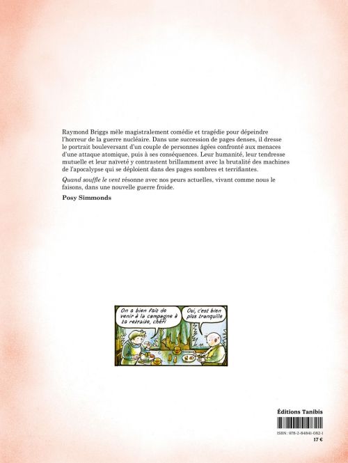 Le trait de Raymond Briggs, âgé de 90 ans, rappellera certainement quelque chose aux habitués des bibliothèques municipales. Son style très british, au crayon à l’encrage fin et aux couleurs douces, sur un dessin proposant des personnages tout en rondeur, évoque celui des journaux anglais de ces années-là et dans une certaine mesure le style des premiers dessins presse de Posy Simmonds. Dans ce conte assez dramatique, l’auteur nous propose un déroulé continu, par le truchement de cases divisées en sept bandes la plupart du temps, quand quelques évocations du passé bénéficient d’illustrations aérées s’étalant sur les pages. Ou, plus régulièrement, un rappel de la situation assez désespérée, avec un dessin sombre montrant les forces en jeux. Les couleurs des bandes, quant à elles, très expressives et joyeuses au début du récit, passent petit à petit, et davantage encore après la page 21 et l’éclair nucléaire, à des couleurs marron puis de plus en plus sombres, tandis que les personnages perdent quelque peu leur assurance, mais surtout leur physique, se dégradant malgré eux. On rit beaucoup dans les premières pages du récit, car les deux protagonistes sont ridiculement décalés face à la situation et sont restés sur leurs réflexes des années quarante. Il faut reconnaître un style fleuri particulièrement savoureux à Raymond Briggs. Néanmoins, celui-ci a vécu enfant les alertes du Blitz, puis s’étant impliqué au sein du CND, la Campagne pour le désarmement nucléaire durant la seconde guerre froide dans les années 1980 de Margaret Tatcher. Il connaît donc bien le sujet traité. C’est ainsi que, sous l’humour, perce la critique d’un gouvernement ayant très mal préparé les habitants à une situation aussi tragique. Cet album, une des rares bande dessinée de l’auteur, paru en 1982 en Grande Bretagne, nous est proposé pour la première fois en langue française. Un texte biographique et critique de Paul Gravett conclut ce bijou, superbe exemple de ce que la bande dessinée classique anglaise peut proposer.