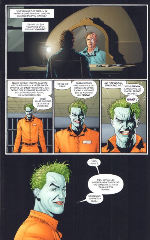 Harvey Kent est un procureur qui a le vent en poupe. Tout lui réussit : même en amour, il vit un bonheur parfait avec une belle artiste. Sa carrière ne fait pourtant que commencer et il compte bien gagner le respect de tout Gotham avec l’affaire Moroni. Le dangereux boss Moroni est convoqué à la barre et Kent ne mâche pas ses mots. Sous le témoignage de Batman, il est accusé de meurtre. Moroni s’agace et déclare qu’il n’est pas responsable de tout cela. Pourtant, le procureur lui montre une pièce de monnaie qui indique deux côtés face, pièce qui se trouvait sur le lieu du crime. Les empreintes de Moroni étaient dessus, ce qui l’accuse irrémédiablement. Moroni, fou de rage, veut faire payer l’outrecuidance de Kent et lui jette une fiole au visage. Batman n’a pas eu le temps d’intervenir pour sauver son ami. Le visage gravement brûlé, il faudra de nombreux jours et plusieurs visites du médecin pour que le procureur s’en sorte. Mais son visage porte les stigmates de l'attentat. Quand Kent se voit dans la glace, il sait que sa vie a basculé à tout jamais. Une colère sourde l’envahit : se laissera-t-il gagner par la vengeance et ce besoin sourd de faire sortir sa violence ou restera-t-il le sage Procureur qu’il était auparavant? Et si la pièce de Moroni l’aidait à faire ce choix ?