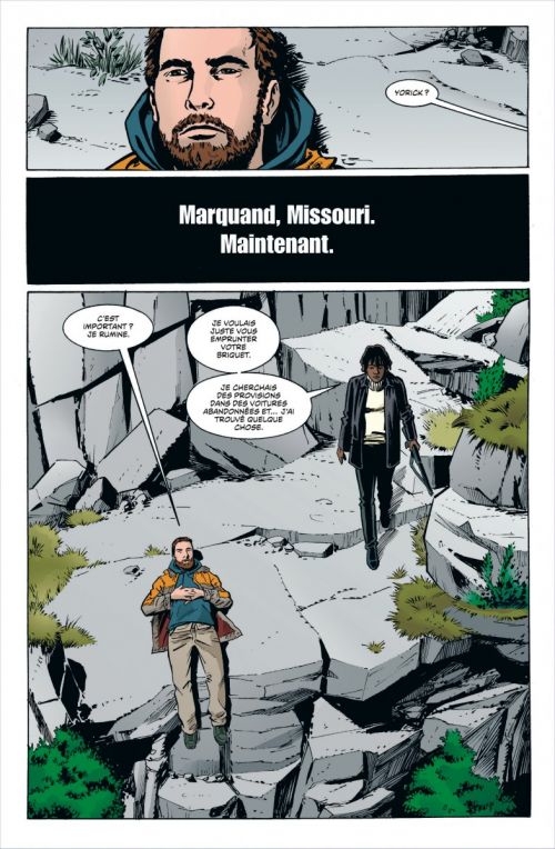 Si vous pensez qu'être le dernier homme sur Terre au milieu de toutes les femmes pourrait être le paradis, c'est que vous n'avez pas encore lu Y, le dernier homme. En effet, au lendemain d'un terrible androcide, Yorick aurait pu se réjouir, mais au vue de la violence et des changements soudains de la société qu'il connaissait, il préfère se faire discret. Accompagné par son petit singe mâle Esperluette, lui aussi seul survivant au terrible drame, et de deux femmes (l'une est son garde du corps et l'autre une scientifique), le héros cherche un moyen de rejoindre sa petite amie située à l'autre bout du globe terrestre. Entre la quête de vérité sur la catastrophe mondiale et le périple amoureux, la série accumule les rebondissements avec une mécanique affutée et rigoureuse. Le scénariste, Brian K. Vaughan, délivre une narration précise où l'humour est très présent et où les surprises sont nombreuses. Dans ce second recueil de 320 pages, il y a des séquences mémorables comme l’atterrissage de la navette, l'hommage au théâtre ou la petite séance de torture de Yorick. Pia Guerra illustre la quasi-intégralité de l'album avec un trait fin et réaliste qui, sans effet spectaculaire, remplit parfaitement son rôle. La canadienne est remplacée pour quelques planches par Goran Parlov et Paul Chadwick, qui illustrent leurs pages dans un style similaire. Un second opus de qualité pour une série incontournable.