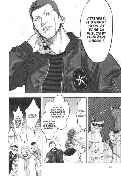 Dans la lignée de Street fighting cat de SP Nakatema, Atsushi Okada nous livre une histoire de chats bagarreurs : oubliez les boules de poils adorables, ici on sort les griffes et on se bastonne. Parfois représentés en humains, parfois sous forme animale, les personnages sont de véritables voyous avec tout ce que cela comporte. Les règles de territoire et d’honneur s’appliquent très bien aux deux, et l’histoire met efficacement en évidence ce parallèle. L’intrigue de fond est assez simple, voire classique, mais le décalage entre le ton très sérieux et le comportement très félin des personnages apporte une bonne dose d’humour. On rigole bien car les gags sont nombreux et bien mis en scène. Les dessins sont également bien fichus, peu importe qu’il s’agisse d’humains ou de chats. Les expressions sont soignées, le découpage et la mise en scène sont très dynamiques, mais il manque parfois un peu de décors. En tout cas, voilà un titre à miauler de rire !