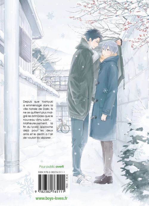 Un lycéen est secrètement amoureux de son ami et camarade, mais la fin de l’année scolaire pourrait bien leur imposer de s’éloigner en intégrant des universités différentes : cette distance à venir va-t-elle s’accroître ou au contraire s’effacer à la fin de l’année scolaire ? On a certes déjà vu des problèmes plus complexes, l’histoire ne brille pas par son originalité. Pour autant, elle prend le temps de bien développer ses personnages, leur passé et leur relation. Du coup, on s’attache à ce duo qui se montre bien sympathique. Leur histoire est mignonne, pas trop compliquée et connaît quelques passages mouvementés. Globalement, c’est assez satisfaisant, on ne se prend pas la tête et les dessins sont tout aussi agréables. Une histoire sympathique.