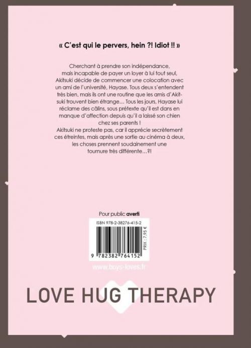 Un jeune homme habitué à faire des câlins avec son chien souhaite combler son manque d'affection avec son colocataire qui accepte tout en trouvant cela un peu étrange. Le scénario n'est pas d'une grande crédibilité, c'est sûr, mais au moins il ne s'encombre pas avec des longueurs. Le duo principal se retrouve ainsi rapidement à se câliner (on parle d'une simple embrassade) et on suit l'évolution de leurs sentiments amicaux en quelque chose de beaucoup plus doux et coquin. Bien que convenue, l'intrigue se montre assez sympathique car elle développe bien ses portraits et possède un bon rythme. Par ailleurs, les dessins sont agréables et savent se montrer coquins sans vulgarité quand la situation l'exige. A tester.