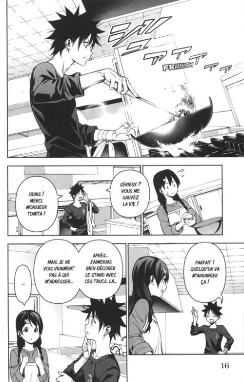 On a l’habitude de voir Sôma trouver une idée de génie lorsqu’il est acculé, aussi le sursaut du garçon en début de volume ne nous étonne pas plus que cela. Néanmoins, sa façon de faire est très originale et son duel contre Terunori connaît des rebondissements savoureux. Puis, un nouveau personnage fait son entrée en scène. On se contente de découvrir son visage, la terreur qu’il inspire aux autres et, surtout, d’apprendre qu’il est le père d’Erina. L’homme (que l’on voit d’ailleurs en couverture) semble incarner une tornade qui va tout balayer sur son passage. On se demande bien ce qu’il va faire pour que l’intrigue change mais son charisme indéniable et les réactions des autres sont très intrigants. Cet apéritif nous donne bien envie d’entamer la suite : on se met à table et on attend d’être servi !