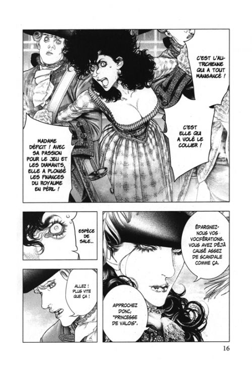 Monstrueusement beau et hypnotique ! Voilà comment on pourrait décrire de sixième opus qui nous offre deux spectacles particulièrement difficiles. Il y a d’abord le supplice enduré par Jeanne de Valois : bien que personnage détestable, la jeune femme subit un calvaire qui fait mal aux yeux, le réalisme des graphismes rendant sa torture d’autant plus douloureuse et cruelle. C’est également l’occasion de voir Charles-Henri et Marie-Josèphe agir ensemble et franchir des limites capitales : une grosse étape est franchie pour les deux bourreaux et c’est toute leur vie qui va basculer. Puis, l’histoire se déplace totalement ailleurs pour nous montrer comment un homme va tuer son père qui a imposé une ceinture de chasteté à l’élue de son cœur : la « pose » de la ceinture est elle aussi difficilement supportable de par son réalisme et son impact visuel. La légère censure ne nous empêche pas de comprendre ce qu’il se passe et il faut avoir le cœur bien accroché. Pour autant, malgré ces épisodes sanglants et éprouvants, on ne tombe pas dans quelque chose de graveleux, gore ou gratuit. C’est en effet une façon de décrire des tortures qui ont existé, de dénoncer les dérives du pouvoir et de nous marquer. C’est une réussite, on est subjugué et on ne peut détacher le regard des pages. Bravo !