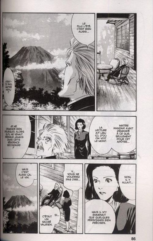 En amenant cette histoire de cave aux nombreux vins mystérieux, le scénariste a eu une idée assez intéressante sur plusieurs points. Tout d’abord, le mélange des binômes permet de faire discuter les protagonistes et de les approfondir un peu, tout en complexifiant encore la situation (Miyabi n’est pas insensible au talent d’Isseï tandis que ce dernier lui fait ouvertement des avances de recrutement, voire plus si affinités, et Shizuku et Loulan sont visiblement fait pour s’entendre tant leur personnalité et leur façon d’appréhender le vin se ressemblent). Ensuite, cette trêve entre les deux frères ennemis est une belle image de ce que la magie du vin peut accomplir en réunissant des gens à l’origine antagonistes. Grâce à cela, on a donc l’occasion de voir Shizuku et Isseï faire équipe et apprécier les qualités l’un de l’autre, et aussi parler de leur passion en oubliant leurs différents. Après cette partie sympathique, l’heure est venue d’entendre l’énigme concernant le 5ème apôtre et, cette fois, cela semble plonger à la fois Shizuku mais aussi Isseï dans un état de stress important. Mais le scénariste rate ensuite son virage et nous propose des rebondissements tellement énormes (un défaut qu’il avait d’ailleurs déjà montré pour un précédent apôtre) qu’ils en décrédibilisent le tout. Ainsi, Shizuku sauve par hasard une jeune fille en montagne qui lui demande ensuite de bien vouloir résoudre une énigme pour elle, qui se trouve être presque la même que celle du testament, à savoir trouver le nom d’un vin qui évoque une montagne précise selon certaines conditions ! Bien évidemment, cela va directement aider le jeune homme à se mettre sur la piste du vin considéré comme le 5ème apôtre... D’une manière également peu subtile, le scénario passe ensuite sur Isseï qui redoute cette histoire de montagne et en fait tout un pataquès pour pas grand-chose, allant même jusqu’à pratiquer de l’hypnose régressive à base de vin pour se rappeler d’un souvenir traumatisant avec sa mère et qui se serait apparemment déroulé en montagne... Bref, tout cela sent le manque d’inspiration et on espère au moins que la suite saura montrer plus de subtilité. Si l’histoire de cette seconde partie déçoit donc un peu, les graphismes sont quant à eux irréprochables, notamment en ce qui concerne les nombreuses scènes en montagne dont les décors sont très bien rendus. Encore une fois, le vrai héros reste le vin et il nous est donné d’en apprendre sur tout ce qui concerne la conservation et les manières de boucher les bouteilles, tandis que d’un autre côté on découvre plusieurs nouveaux crus alléchants, et notamment des blancs. Si cet opus ne fait pas dans la subtilité scénaristique, l’intérêt est dont toujours présent grâce à un fond solide, tel un vin italien au corps puissant et qui manquerait un peu de finesse mais qu’on peut tout de même apprécier d’une autre manière.