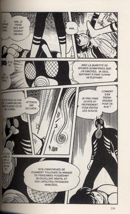 On a bien compris que Kamen Rider doit se battre contre l’organisation Shocker qui a des sbires partout et donc dans l’entourage de Takeshi. Toutefois, ce n’est pas pour autant que l’histoire s’enlise dans des chapitres répétitifs avec un méchant différent à abattre. Au contraire, l’intrigue prend une tournure inattendue car, dans la toute première partie, le personnage principal décède et il ne reste plus que son cerveau, Hayato prenant alors sa relève ! Même si l’histoire date, on constate que le pari est audacieux aussi bien à l’époque que de nos jours. Heureusement, cela fonctionne plutôt bien et met plus en valeur le nouveau héros. Mais ce n’est pas la seule surprise : Hayato retourne dans son village natal où un homme-crabe sème la terreur, puis s’intéresse aux affaires d’une entreprise électronique de mèche avec Shocker et pour laquelle travaille la femme qu’il aime. L’amour (familial et sexuel) s’intègre dans le récit pour donner un peu de tension sentimentale, en plus de tout le suspense généré par le flot d’action : homme-crabe, homme-panthère, homme-mite et encore bien d’autres viennent attaquer Kamen Rider, ainsi que d’autres robots terribles et agressifs. En outre, les graphismes sont de très bonne qualité et le mangaka s’offre de nombreuses doubles-pages impactantes. Le dynamisme est de rigueur tout du long même si quelques passages manquent un peu de fluidité. Les rares flash-backs ne sont pas bien mis en évidence mais on s’y retrouve tout de même. En tout cas, ce second volume est aussi surprenant qu’enthousiasmant.