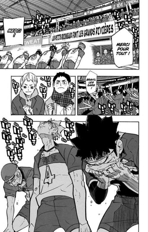Comme dans tout tournoi qui se respecte, les matchs s'enchainent et présentent au fur et à mesure de nouvelles têtes. Ce tome n'échappe pas à la règle et met donc en avant quelques nouveaux joueurs. Les garçons en question sont sympathiques, mais ne sont pas amenés à jouer un grand rôle, donc on est un peu perplexe quant à l'utilité de tout ça. Quant aux joueurs de Karasuno, ceux-ci ne lâchent rien et se préparent à la suite. Toutefois, leur façon de faire est plutôt relax et on s'amuse à leurs côtés sans qu'il n'y ait de véritable changement. C'est donc un volet qui marque une pause de manière sympathique mais pas indispensable.