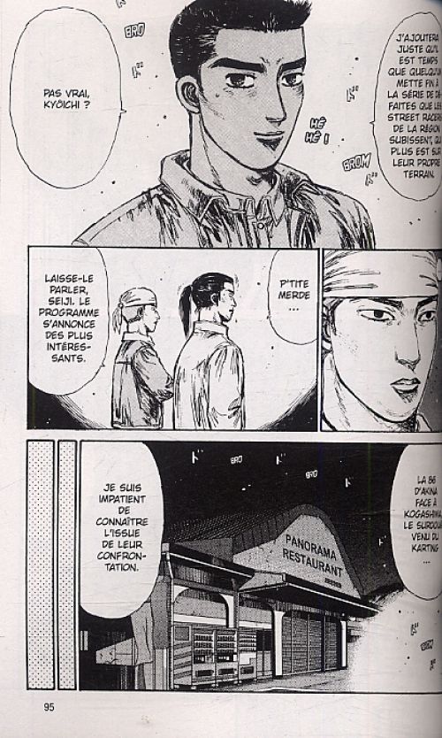 Sans laisser beaucoup de temps pour se remettre de la course précédente, les chapitres reprennent dès le lendemain, lorsqu’un nouvel adversaire vient défier Takumi. Il s’agit cette fois (mais comme toujours d’une certaine façon) d’un véritable challenge puisque, si Takumi s’est formé très tôt en effectuant dès son plus jeune âge les livraisons pour son père en allant toujours plus vite sur les routes de montagne, son adversaire n’est quant à lui pas en reste en affichant également un palmarès impressionnant. Ce dernier a en effet été champion de karting, ce qui lui a donné une grosse expérience pour ce qui est de gérer les techniques de conduite sportive, la gestion des virages à pleine vitesse ainsi que les dérapages. Mais ce n’est pas tout : après cela, le jeune homme a sévi sur 2 roues avant de revenir à la voiture, ce qui lui fait relativiser le danger d’une toute autre manière une fois derrière un volant. Bref : surdoué, entraîné et sans peur superflue, voilà un homme de taille à affronter le héros. Loin de trop en faire, le duel arrive vite et se montre prenant et un peu plus intéressant que certains des précédents affrontements, puisque des techniques inédites sont montrées et que la stratégie a une réelle importance. Autre point sympathique, l’auteur utilise beaucoup les phylactères de narration lors de la course, pour un rendu efficace. Le reste, par contre, n’avance pas d’un poil : plusieurs scènes nous font comprendre que Takumi n’est toujours pas décidé à entrer dans la nouvelle team (ce qu’on savait déjà), et d’autres nous montrent quant à elles que Natsuki est toujours en train de regarder de loin le jeune homme qui ne lui a pas reparlé depuis un certain nombre de volumes maintenant. Du remplissage un peu inutile donc, mais qui permet de faire une petite transition entre deux battles. Pour autant, on aurait préféré que cela se montre un peu plus constructif. Comme toujours donc, la série s’intéresse surtout au racing et oublie un peu les à-côtés : les amateurs apprécieront, mais ceux qui aimeraient un peu plus de diversité commencent sûrement à trouver le temps long.