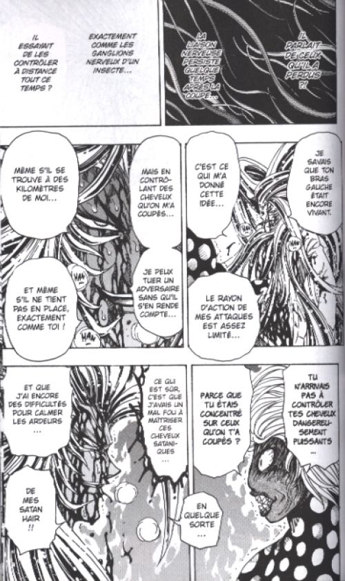 Voyant que ses insectes ne viennent pas à bout de Sunny, Tommyrod s’impatiente et décide de se battre en personne. Il tient absolument à couper les cheveux sataniques de Sunny. Hélas, ce dernier ne compte pas se laisser faire et c’est avec une vitesse incroyable qu’il utilise une mèche pour couper un bras à son ennemi. Surpris mais loin d’être abattu, Tommyrod comprend qu’il ne s’était pas trompé sur le niveau du Gourmet Hunter. Toutefois, c’est la première fois que Sunny utilise des cheveux démoniaques et il ne les maitrise vraisemblablement pas individuellement. Tommyrod aurait-il trouvé la faiblesse de son adversaire ?