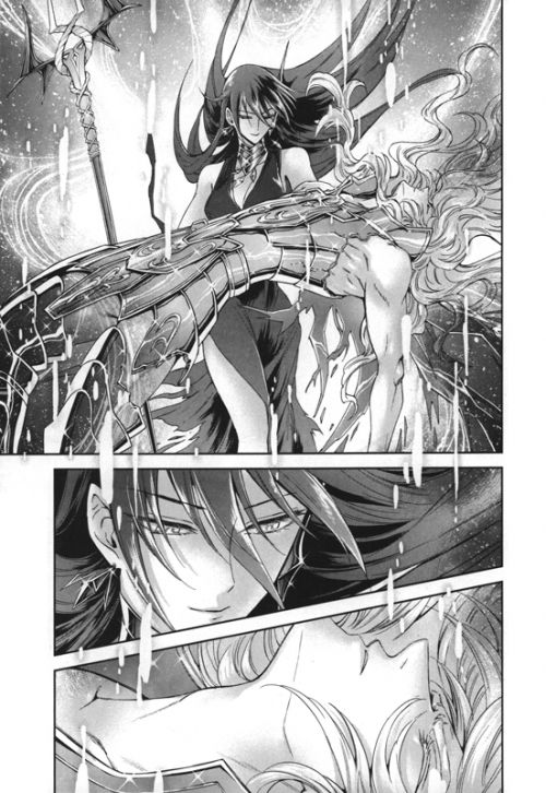 Si le onzième volet s’était montré des plus enthousiasmants depuis le début de la série, ce douzième déçoit un peu plus. Tandis que sur Terre, les chevaliers d’or (enfin seulement Milo du scorpion dans les présents chapitres) affrontent les chevaliers maléfiques accompagnant une comète géante qui approche de la Terre pour la détruire, les Saintia continuent leur périple dans la dimension cachée du temple d’Eris. Seulement, ces dernières se retrouvent face à un adversaire qui, au lieu de les réduire à néant, va simplement les envoyer courir chacune de son côté à la recherche de leur épingle d’or, épingles qu’il a disséminées au préalable dans tout le royaume. L’intérêt de la manœuvre n’est que scénaristique : cela permet de développer de mini aventures annexes pour chacune des Saintia, mais surtout cela rallonge (inutilement pourrait-on estimer) la sauce en faisant stagner l’avancée de l’histoire générale. Si on n’est pas convaincu par ces circonvolutions qui ont un côté frustrant, on apprécie quand même de creuser un peu le background des jeunes femmes au travers de leurs errances en solo. Ce n’est pas inintéressant, c’est seulement que cela ralentit sévèrement le rythme. Même si le dessin est toujours aussi travaillé, les planches se font également moins spectaculaires, tout simplement car les combats sont moins importants et qu’il y a beaucoup de flash-backs servant à présenter des moments particuliers de la vie des personnages. En résumé, ce volume se montre un peu moins convainquant que son prédécesseur. Espérons que la suite sera plus prenante, mais il est fort probable que les prochains volets continuent un moment sur des chemins annexes (puisqu’il va falloir terminer les aventures solo de chacune des Saintia) avant de reprendre le fil de l’aventure principale.