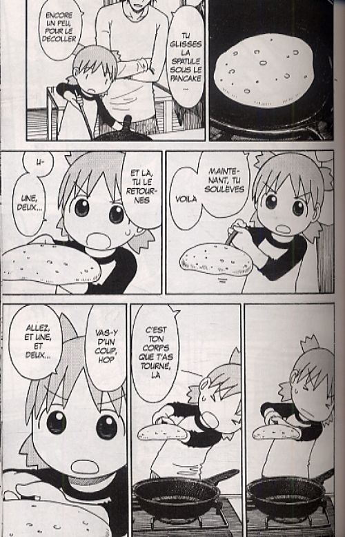Encore une fois, Yotsuba nous fait partager avec son enthousiasme des découvertes toujours plus incroyables. Ici, la petite apprend entre autres à faire des pancakes, profite des joies d’un magasin d’électro-ménager, tente de mentir à son père et fait des retrouvailles pleines d’émotions. Ce sont toujours des choses de la vie quotidienne qui sont sublimées grâce au regard de Yotsuba qui parvient de faire de n’importe quelle situation un grand moment d’aventure et/ou de gags. La recette est toujours la même mais, une fois qu’on a goûté à la série, il est impossible de décrocher : la candeur de Yotsuba, alliée à sa jovialité et à la facilité avec laquelle les personnages rentrent dans son jeu, est particulièrement bien mise en scène. De plus, les expressions faciales renforcent l’effet comique des situations et les têtes des personnages sont ainsi souvent impayables. A noter que Cartox vous salue si vous retirez la jaquette ! En fait c’est simple, Yotsuba & est un véritable remède contre la mauvaise humeur : un simple chapitre et on est requinqué !
