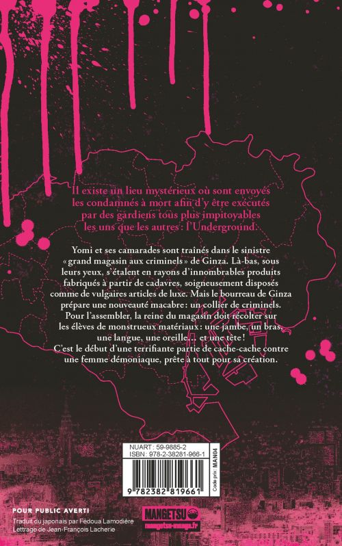 Les élèves survivants se retrouvent dans le grand magasin aux criminels de Ginza. Dans un premier temps, ils admirent les articles et mets proposés à la vente. Cependant, en regardant les étiquettes, ils comprennent que chaque article est fabriqué à partir de camarades morts. Puis, une voix se fait entendre et leur explique les règles de la prochaine épreuve : le bourreau va devoir récupérer cinq morceaux sur les élèves, dont l'un d'eux sera la tête de Yomi...