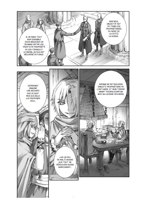 Toujours dans la cité de Ghelbe, Lawrence se retrouve mêlé aux histoires entre les comptoirs du nord et du sud de la cité, chacun ayant des desseins politiques et financiers. Ici, les choses deviennent beaucoup plus séreuses car on découvre les véritables objectifs de tous les camps et les moyens de pression utilisés pour parvenir à leurs fins. Malgré des dialogues assez longs, l’intrigue reste palpitante et dégage pas mal de suspense car on s’attend à ce que la situation vole en éclats d’un instant à l’autre. En outre, les révélations faites par certains personnages les rendent d’autant plus intéressants qu’elles nous permettent de voir les choses sous un nouveau jour. La tension monte donc tout du long et atteint son paroxysme à la fin : autant dire qu’on a déjà du mal à attendre la suite !