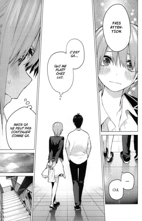 Au fil des chapitres, les quintuplées montrent à Uesugi qu’elles sont décidées à s’investir dans les études, même si leurs faiblesses et emplois du temps ne facilitent pas les choses. En outre, une compétition amoureuse s’engage doucement autour du jeune homme qui n’en a pas conscience du tout. Dans les faits, il faut bien le dire : la situation n’évolue pas vraiment et les personnages s’agitent pour pas grand-chose. Il y a bien un nouveau personnage qui s’invite mais tardivement, aussi il va falloir attendre la suite pour que cela soit réellement exploité. Le reste n’est qu’un remplissage où chacune des quintuplées a son petit moment en vedette, et on a le sentiment que l’auteur cherche un peu une idée pour relancer l’histoire. Peut mieux faire donc.