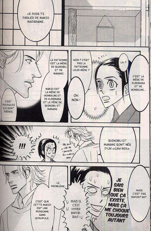Ce n’est pas ce quatrième volume qui va nous faire oublier la médiocrité du scénario car celui-ci continue dans la même veine avec l’apparition de la mère de Kinumasa : celle-ci drogue et prostitue son enfant en trouvant cela tout à fait normal... Sur la moitié du volume, on assiste donc à une histoire aussi consternante que mal réalisée et la deuxième partie se montre déjà vaguement plus intéressante en nous présentant la rencontre des parents de Hidekuni. D’ailleurs, on a le droit à des révélations sur les parents des personnages mais, entre les hommes qui sont des mères et les femmes qui sont des mères et/ou des pères, le lecteur sera plus perdu qu’autre chose. Quant aux graphismes, ceux-ci sont toujours inesthétiques avec des personnages difformes et des décors simplistes (quand ils sont là). On notera par ailleurs qu’il n’y a aucune scène coquine dans ce volume mais ce n’est pas plus mal car, comme d’habitude, elles auraient été très glauques. Bref, un quatrième opus aussi inutile que ses prédécesseurs.