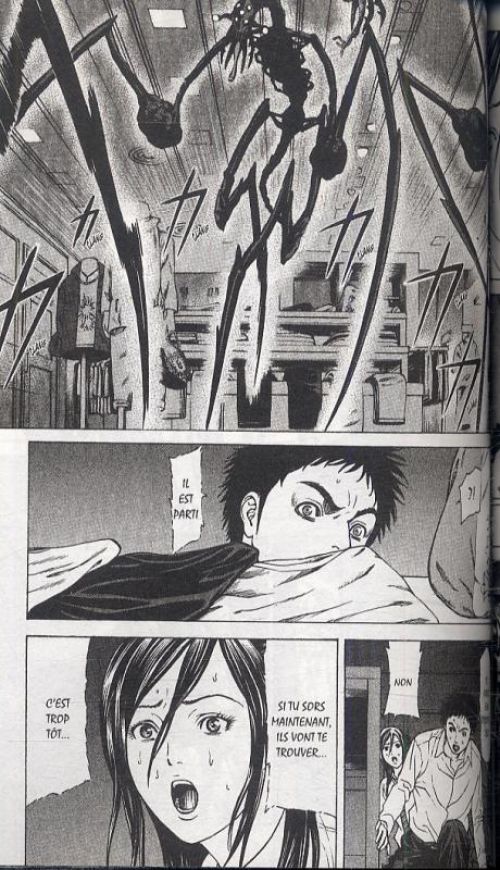La fuite de Takashiro se poursuit ici mais de nombreux changements ont lieu. D’abord, le trio auquel il appartient rencontre d’autres survivants qui se sont réfugiés dans un cinéma. C’est alors l’occasion non pas de se poser mais de reformer des groupes. Néanmoins, les discussions ne s’éternisent pas pour autant car Takashiro veut toujours rechercher son amie d’enfance. Cela permet de nouvelles incursions en ville où les extra-terrestres n’ont pas fini de faire des victimes. Les amateurs du genre seront ravis car le sang coule à flot et les personnages se font tuer sans la moindre hésitation. De plus, le récit ne se contente pas de nous montrer un carnage, on a également le droit à quelques révélations intéressantes sur la situation de la ville, et le comportement des créatures réserve également quelques surprises. Le tout possède un rythme très nerveux et les visuels sont très impactants, ce qui rend ce second volume plutôt enthousiasmant et nous donne une envie ardente de lire la suite.