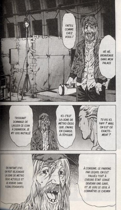 Le groupe de Shirasaki poursuit sa fuite à l’aide d’Ujiie. Celui-ci fait quelques révélations sur l’apparition des monstres (on découvre que le gouvernement fait des recherches depuis une quinzaine d’années sur ces bestioles) avant de s’engouffrer dans un chantier abandonné du métro. Si les quelques informations dévoilées sont intéressantes et expliquent la réactivité des soldats, on est un peu déçu par ce qui arrive au groupe : entre Midori qui est un vrai boulet incapable de marcher sans se faire attaquer et de situations à la limite du ridicule (comme la fuite d’un brouillard toxique), les scènes d’action sont certes rythmées mais moins palpitantes que ce qu’on a déjà pu voir, les rebondissements étant souvent trop gros pour être crédibles. Toutefois, les deux grosses étapes qui sont franchies changent un peu le décor et laissent de l’espoir pour la suite qui s’annonce de plus grande envergure. On espère que cela va être le cas et que les défauts de ce volume seront ainsi gommés et vite oubliés.